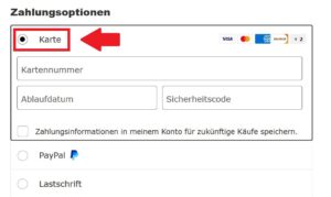 5. Under the heading „payment options“ (Zahlungsoptionen) choose „card“ (Karte). Enter your credit card number, the expiration date and the 3-digit security code.