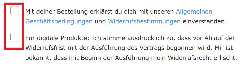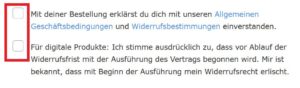 6. Check the boxes to confirm to the general terms and conditions (Allgemeine Geschäftsbedingungen) and the cancellation policy (Widerrufsrecht). Please note that for digital products I cannot offer refunds.