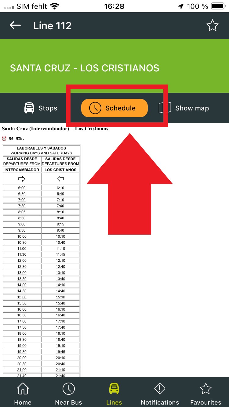 Beachte, dass die Fahrtzeiten sich eventuell ändern können. Den jeweils aktuellen Fahrplan findest du auf der Webseite von TITSA.
