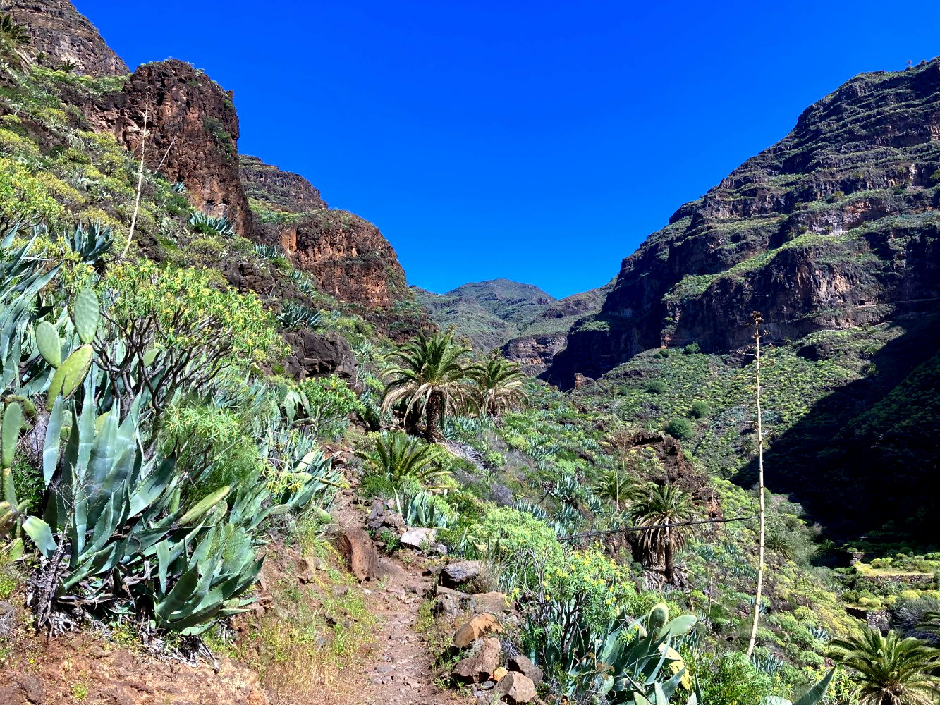 Dass es die ganze Zeit aufwärts geht, stört mich nicht unbedingt, auch wenn es in der Hitze verdammt anstrengend ist. Ärgerlich ist nur, dass ich noch viel zu viel Strecke vor mir habe. Wenn ich den Zeitplan noch irgendwie einhalten will, müsste ich heute noch zurück an die Küste, dann wieder durch den schwierigen Barranco de Argaga nach Gerian und dann nochmal runter nach Valle Gran Rey.