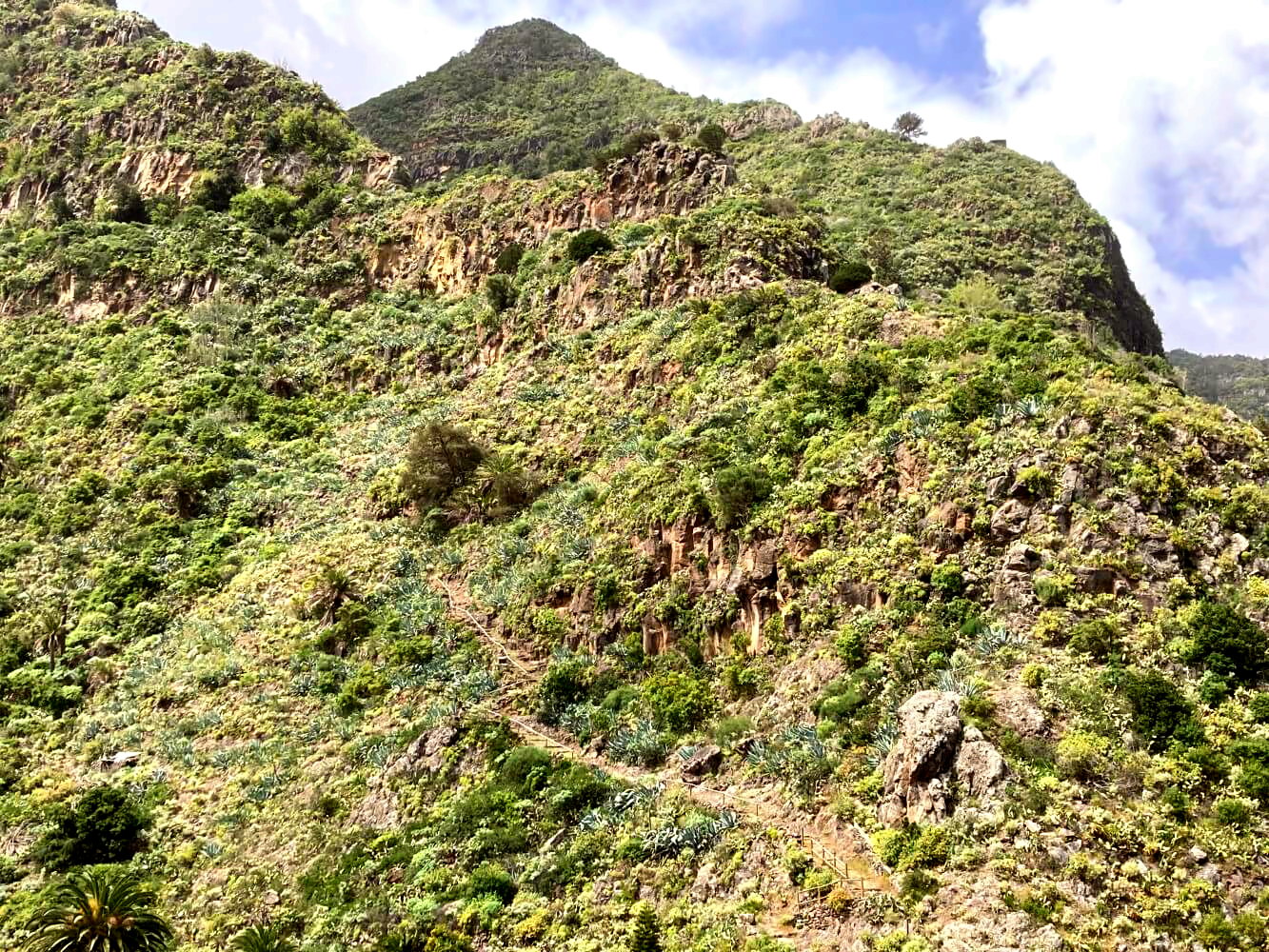Die Aussichten ins Tal, die sich zu meiner linken bieten, sind wie immer spektakulär. Der üppig grüne Barranco, in dem Hermigua liegt, wirkt wie ein riesiges Amphitheater, das von mehreren kleinen Hügelketten durchzogen wird. Im Hintergrund steile Felshänge, die sich zum zentralen Bergland der Insel erheben. Ein Anblick, bei dem man aus dem Staunen nicht mehr rauskommt.
