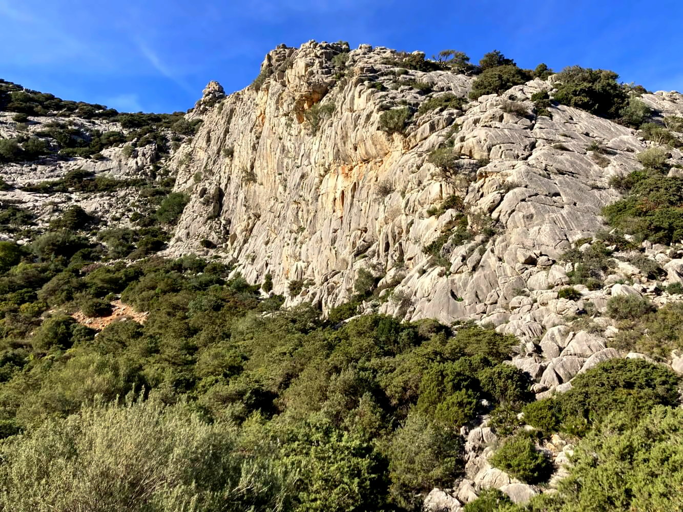 Für den letzten Abschnitt verlassen wir den offiziellen GR 249, der etwas uninspiriert auf einer Piste nach El Chorro führt und wechseln stattdessen auf den „Camino Geologico“. Dieser Weg verläuft sehr schön mitten durch den Kiefernwald und bietet tolle Ausblicke auf die Steilwände von El Chorro. Die letzten Strahlen der untergehenden Sonne tauchen die Felsen in ein magisches Licht – traumhaft schön, auch wenn der Rest der Etappe seine Längen hatte.