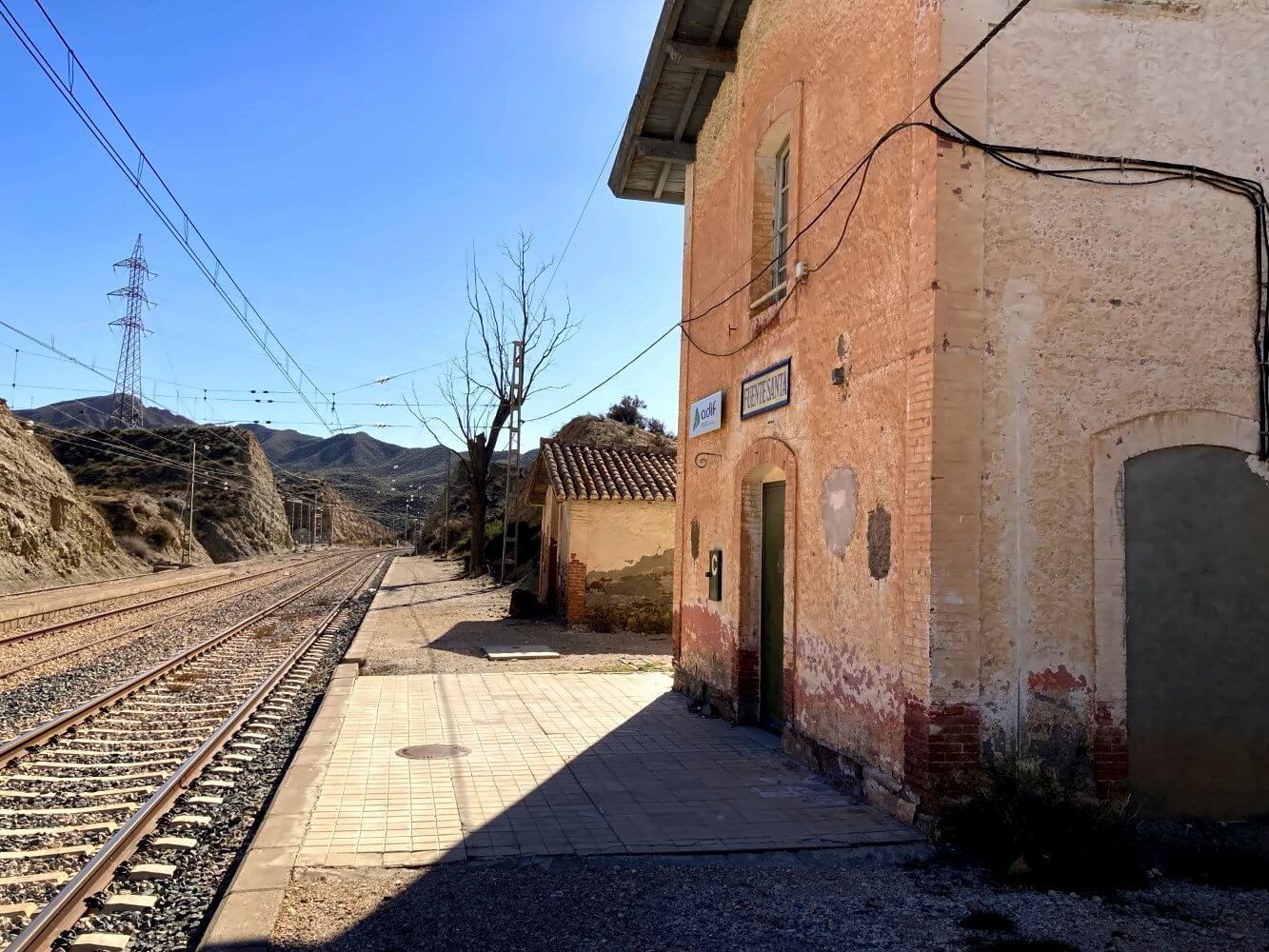 Das Bahnhofshäuschen scheint aber noch intakt. Jedenfalls sind hier immerhin noch Scheiben in den Fenstern. Eines der Gleise wird offensichtlich auch noch benutzt. Als ich die Stadt hinter mir lasse, rauscht ein Schnellzug vorbei, der hier natürlich nicht anhält. Erstaunlich finde ich aber, dass überhaupt mal jemand an diesem gottverlassenen Ort gelebt hat.