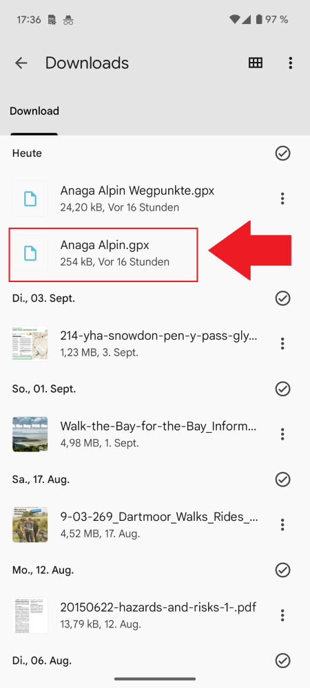 - Gehe in den Ordner, in dem die GPX-Datei gespeichert ist (bei mir z.B. „Download“.