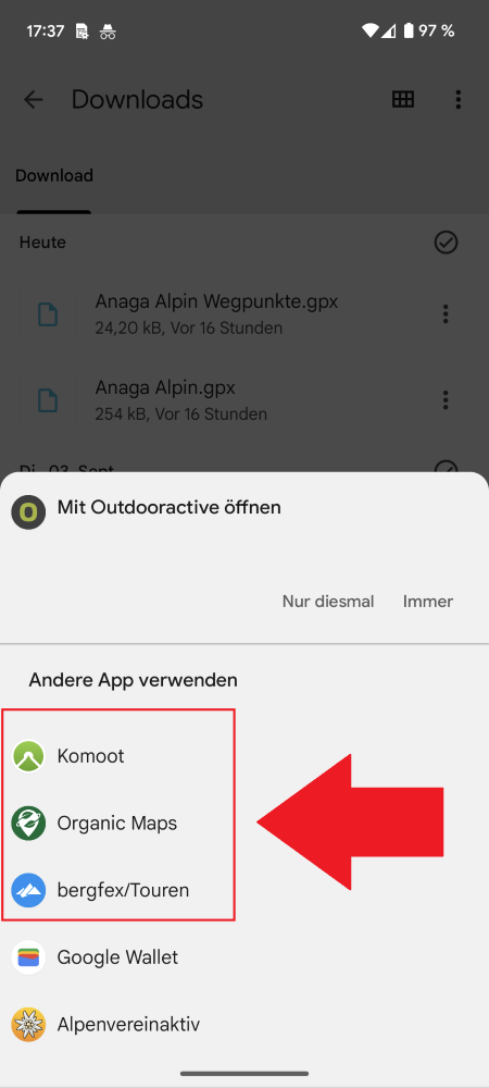 - Es öffnet sich automatisch ein Drop-Down-Menü. Wähle die App aus, mit der du die GPX-Datei öffnen willst.