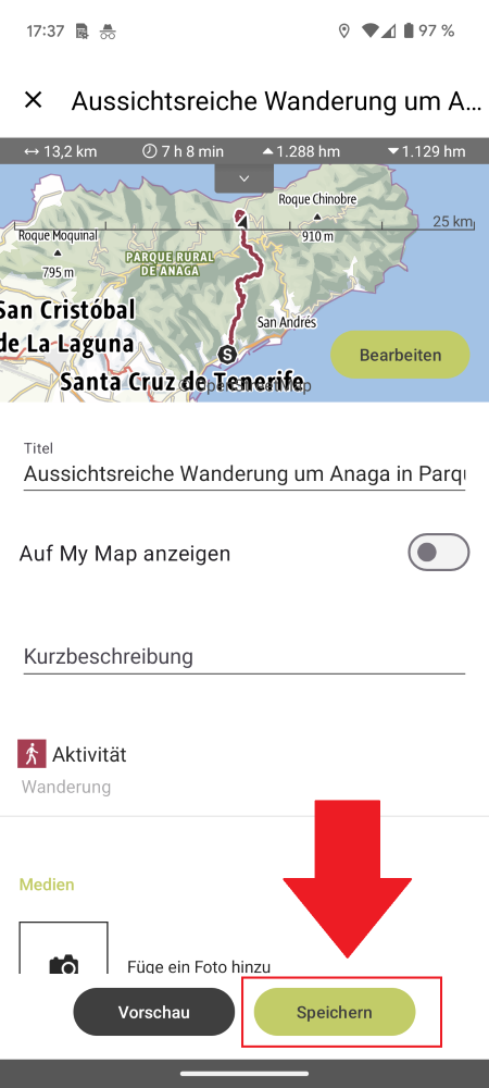 8. Klicke dann auf „Tour speichern“ und gib der Tour evtl. noch einen Namen. Die Datei wird dann importiert.