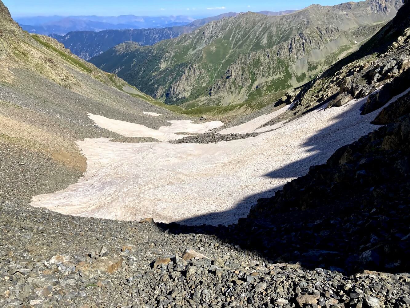 Aber erstmal erwartet mich ein ausgedehntes Firnfeld als nächstes Hindernis. Okay… sieht gar nicht sooo schlimm aus. Davor muss ich natürlich erst noch die Schuttrampe auf der anderen Seite des Passes wieder runterkraxeln. Es geht aber eigentlich, wenn man vorsichtig ist. Der Schnee ist dann auch schön fest und das Ganze ist zum Glück auch nicht wirklich steil.