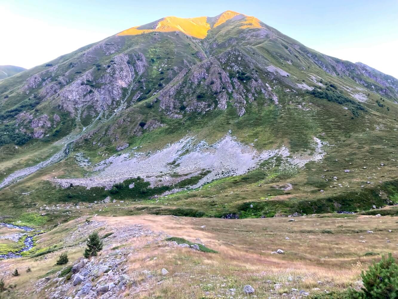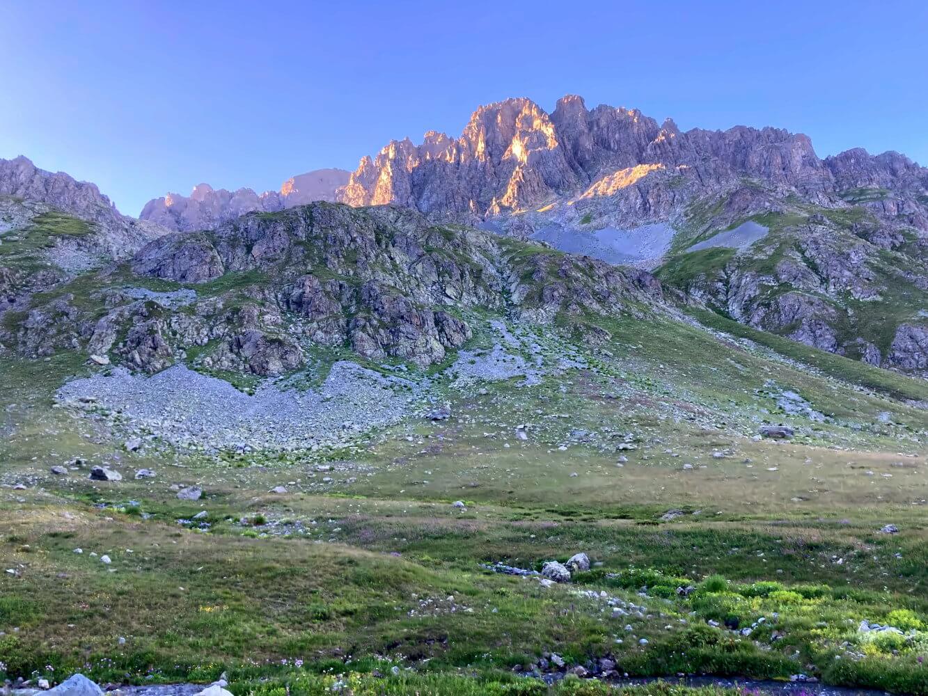 Etwas oberhalb meines Standortes entdecke ich einen winzigen Farbtupfer im Schatten eines namenlosen 3.000ers – der Libler Gölu. Eigentlich wollte ich an diesem See zelten. Aber dazu müsste ich mindestens nochmal eine Stunde ohne jeden Weg über steile, felsübersäte Grashänge kraxeln. Ich begnüge mich mit dem Lager am Bach und genieße am Abend den wundervollen Blick auf die rotglühenden Gipfel, die mich umgeben.