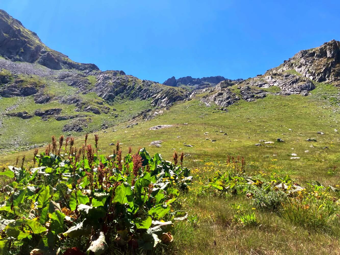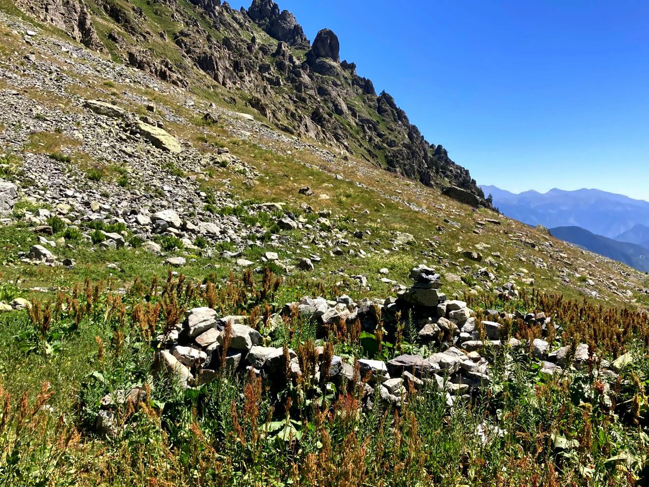 Nach dem Pass wird es schwieriger. Auf der Karte ist ein Weg ins Tal eingezeichnet. Tatsächlich, so stelle ich bald fest, ist das nichts weiter als eine gedachte Ideallinie. In Wirklichkeit gibt es hier nicht den Ansatz eines Weges und ich muss mir selbst die beste Route suchen. Im dichten Gras verstecken sich überall Felsbrocken, manchmal muss ich mich durch hüfthohes Unkraut kämpfen. Ich komme nur langsam voran.
