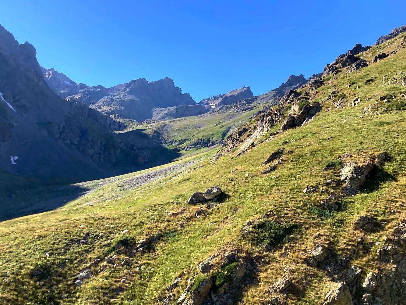 Aber gut. Häufig ist es im Gebirge ja so, dass man auf den zweiten Blick doch einen Weg entdeckt. Auch furchtbar abschüssiges Gelände ist aus der Nahperspektive oft gar nicht mehr so schlimm. Und genau so ist es auch hier: Hinter dem Sattel, auf dem ich stehe, führt tatsächlich ein versteckter Trampelpfad bis zum unteren Ende des Passes. Von hier wirkt es dann schon gar nicht mehr so furchteinflößend.