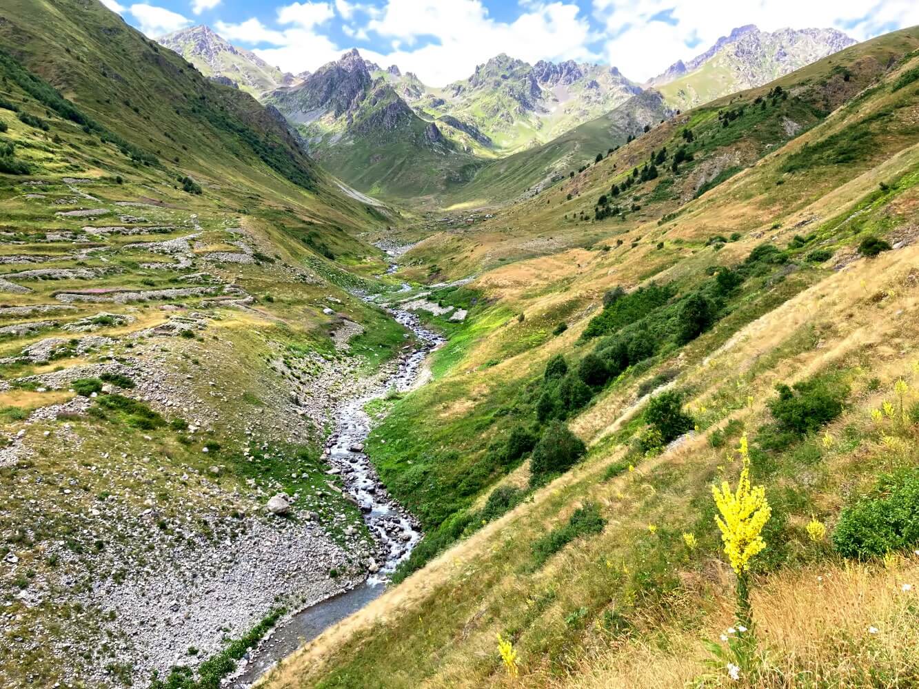 Am nächsten Morgen laufe ich im Sonnenschein wieder ins Tal zurück. Auf den Wiesen rund um die Yayla tummeln sich etliche Frauen mit Kopftüchern und auch ein paar Spaziergänger sind unterwegs. Die Häuser der Alm wirken in der klaren Morgenluft schon viel freundlicher, ich bleibe aber nicht lange, sondern mache mich direkt auf den Weg nach Osten. Zwei Pässe will ich heute überqueren, einer davon über 3.000 Meter.