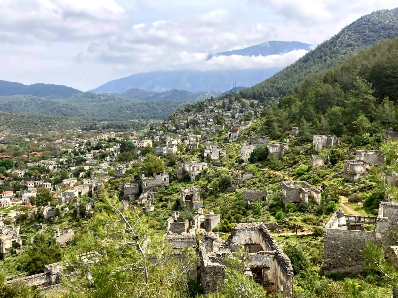Der offizielle Weg beginnt eigentlich in Ovacık. Ich will mir vorher aber noch die „Geisterstadt“ Kayaköy anschauen. Der in einem Gebirgstal gelegene Ort wurde bis 1923 von etwa 20.000 ethnischen Griechen bewohnt. Nach dem Vertrag von Lausanne und dem dort vereinbarten „Bevölkerungsaustausch“ wurden die Bewohner nach Griechenland ausgewiesen. Gleichzeitig wurden Türken angesiedelt, die dann aber eine neue Siedlung unterhalb des Dorfs gründeten.
