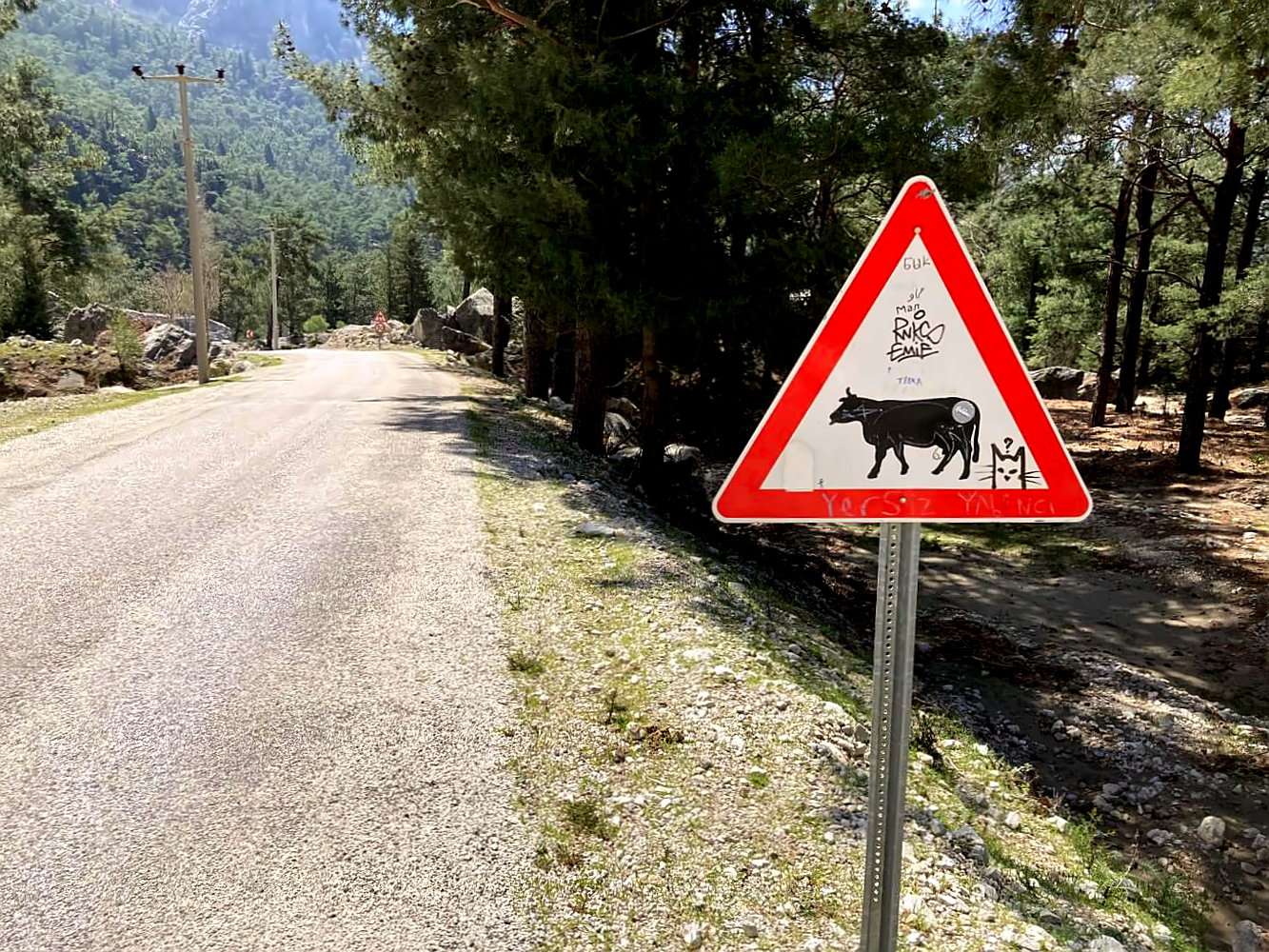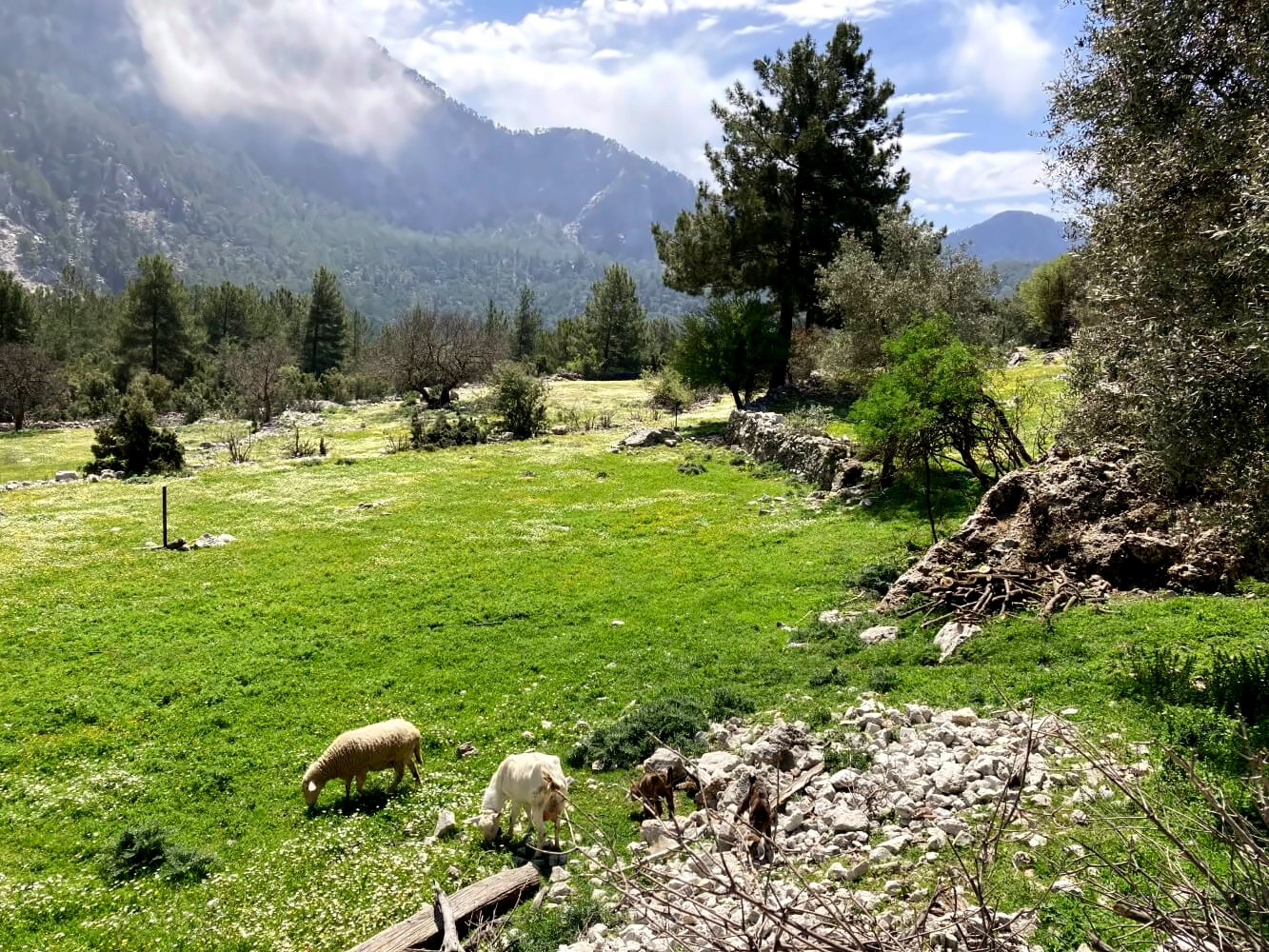 Nach dem Pass geht es bis zu den verstreuten Häusern der Siedlung Kozağaç und danach auf Schotterpiste bis nach Kirme. Die Aussichten auf das Taurus-Gebirge sind vom Allerfeinsten. Der Weg führt recht nah an die hellen Kalksteinwände heran, die in der Morgensonne wie blitzblank poliert glänzen. Unterhalb davon erstrecken sich saftig grüne Wiesen, auf den Schafe und Ziegen grasen – eine herrliche Landschaft!
