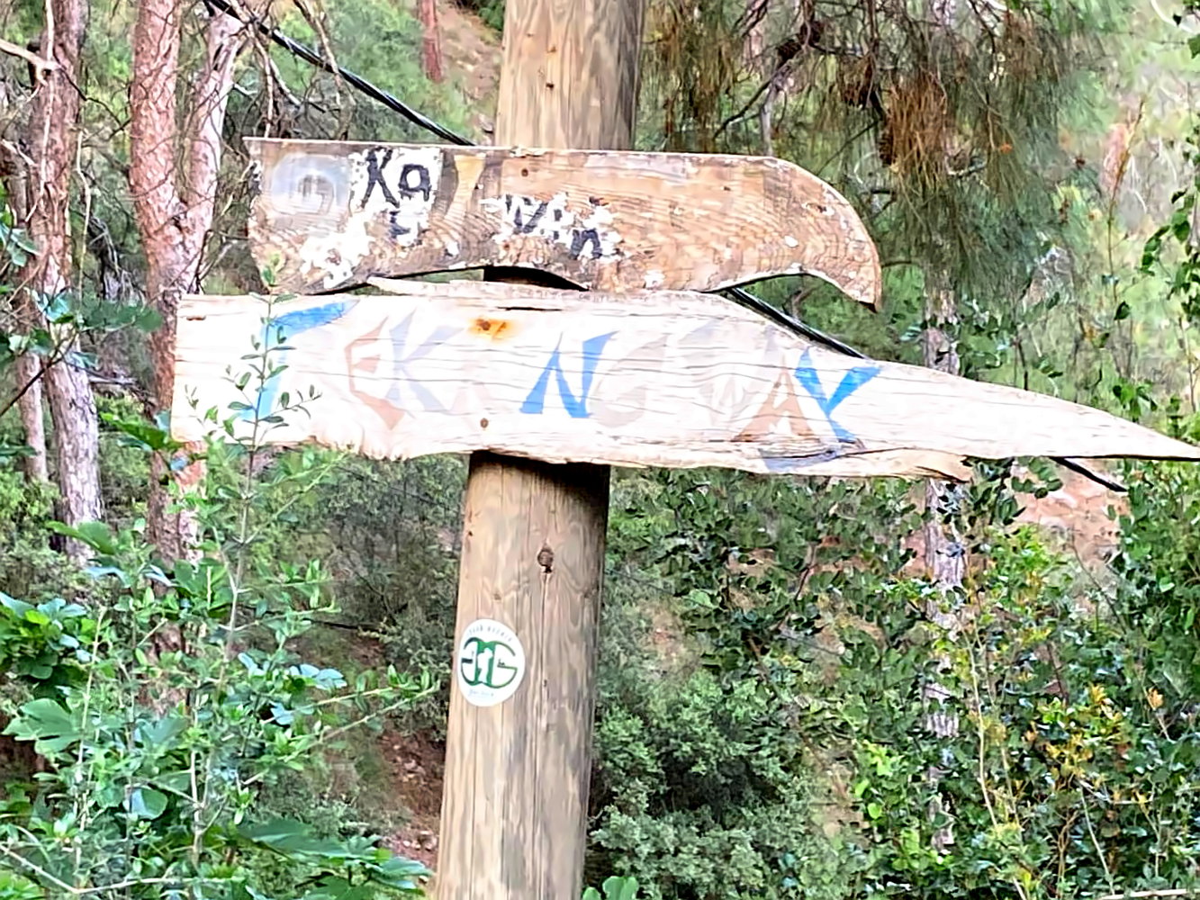 An einer Abzweigung unter einer Felswand begegne ich einer weiteren Wandergruppe aus Russland. Der Wegverlauf ist nicht ganz eindeutig, links geht es steil über Geröll hoch, rechts führen ein paar Trampelpfade in den Wald. Ich versuche es zunächst im Wald. Nach ein paar Minuten wird mir das ganze aber zu steil für meinen schweren Rucksack. Also wieder zurück und tatsächlich entdecke ich jetzt eine Markierung. Also doch durch das Geröll.