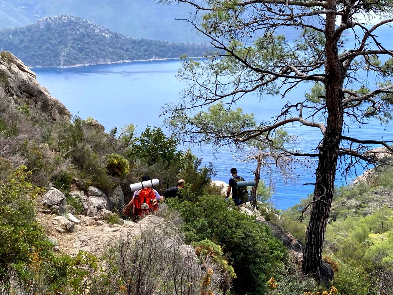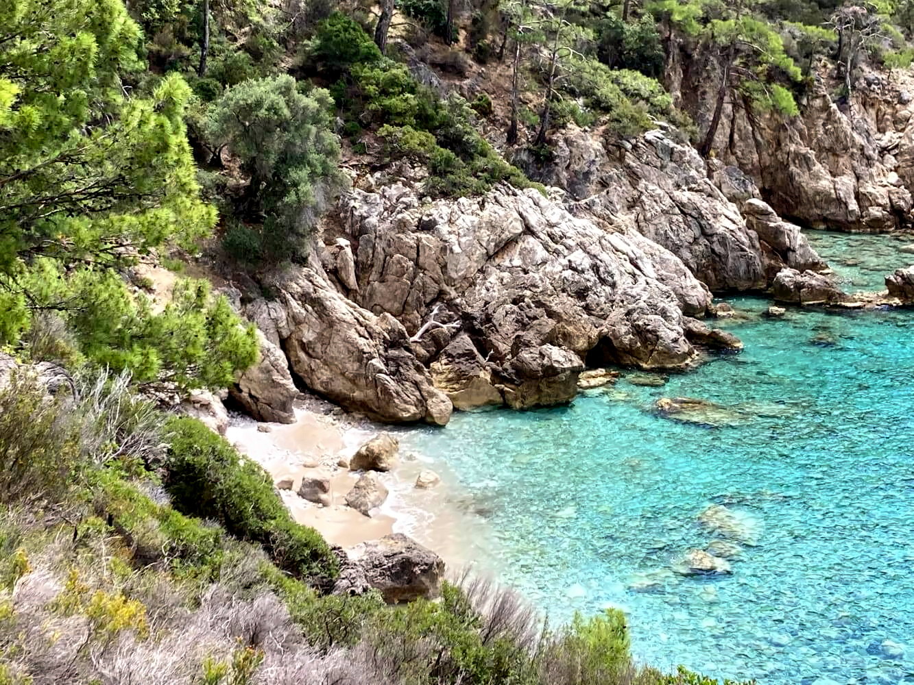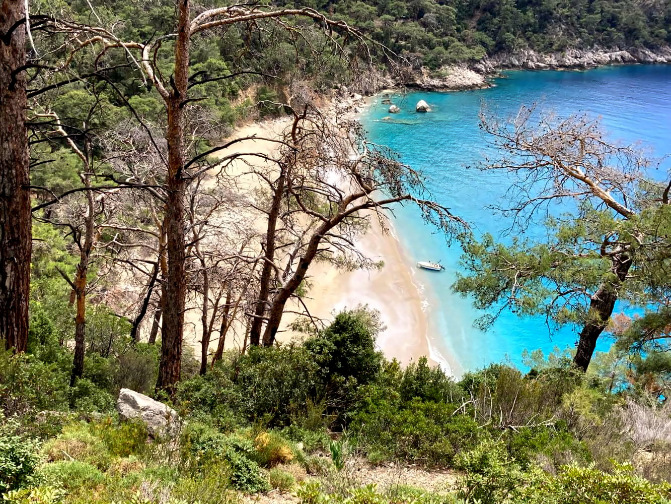Der Rest des Weges bleibt kraxelig, ist aber einfacher. Es ist ein richtig schöner Gebirgsweg, der immer oberhalb der Küste verläuft und absolut geniale Aussichten auf das türkisblaue Wasser des Mittelmeers bietet. Ein wahrer Hochgenuss und für mich bis jetzt das beste Stück des gesamten Likya Yolu. Viel zu schnell kommt der Paradies-Strand in Sicht der auch hält, was sein Name verspricht.