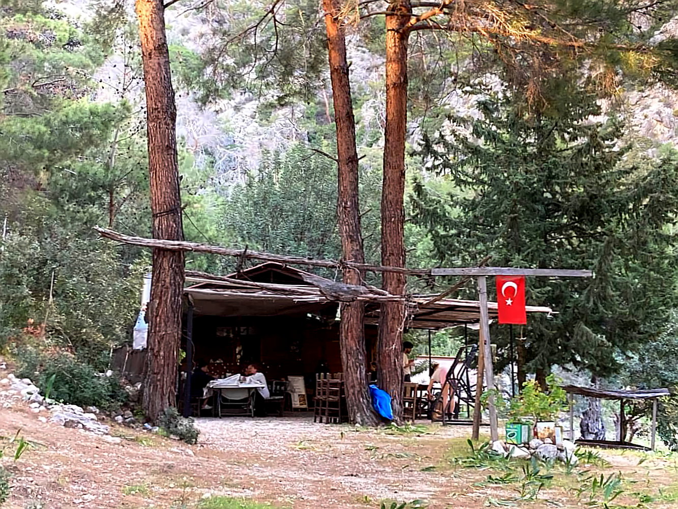 Wasser gibt es am Cennet Beach nicht. Ist aber auch kein Problem. Etwa 10 Minuten oberhalb des Strandes gibt es einen kleinen Campingplatz, wo man Wasser bekommt und sogar bekocht wird. Das ist eine Sache, die mich in der Türkei immer wieder fasziniert. Man kann an den abgelegensten Orten sein. Aber sobald sich rumspricht, dass ab und zu mal Touristen vorbeikommen, ist die Chance ziemlich groß, dass irgendjemand ein Teehaus oder ein kleines Lokanta aufmacht.