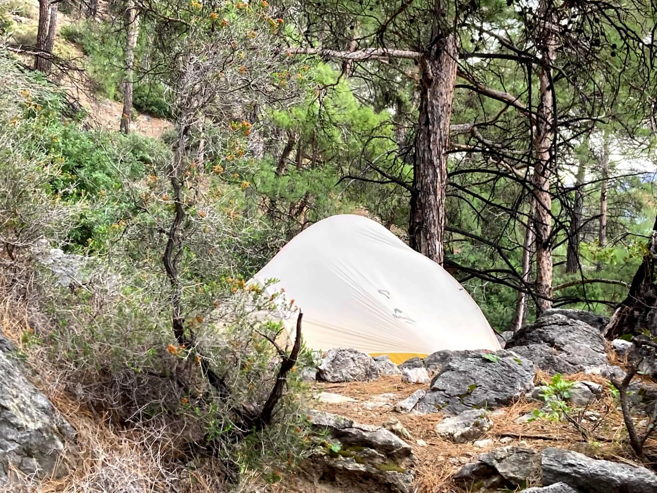 Der Anfang ist eigentlich noch recht zivil. In stetigem Auf und Ab führt der Pfad durch den Küstenwald, aber es wird schnell recht steinig. Nach zwei Kilometern treffe ich mal wieder auf einen russischen Trekker, der quasi mitten auf dem Weg sein Zelt aufgeschlagen hat und gerade beim Aufstehen ist. Viel Platz zum Campen ist hier auch wirklich nicht.