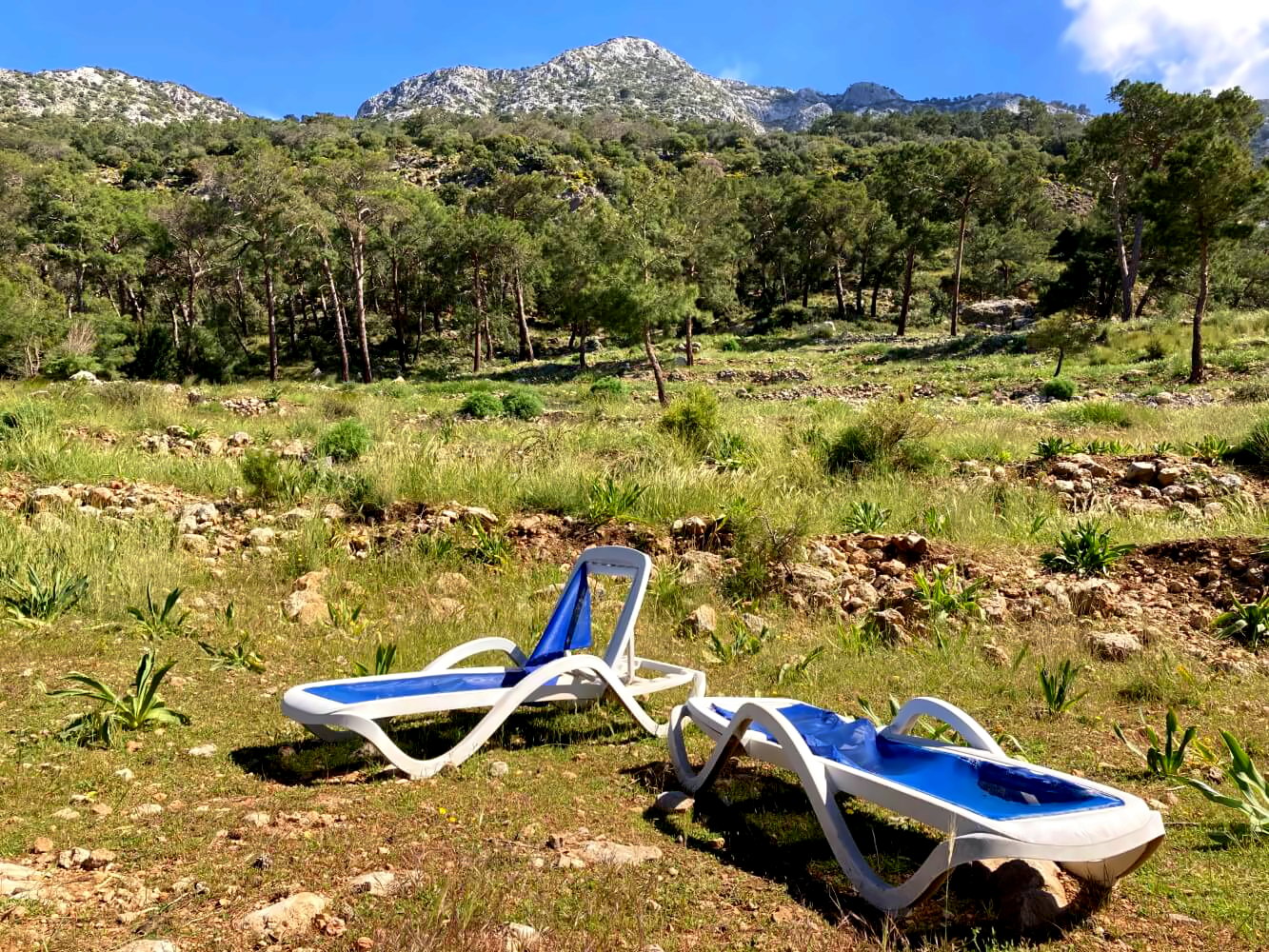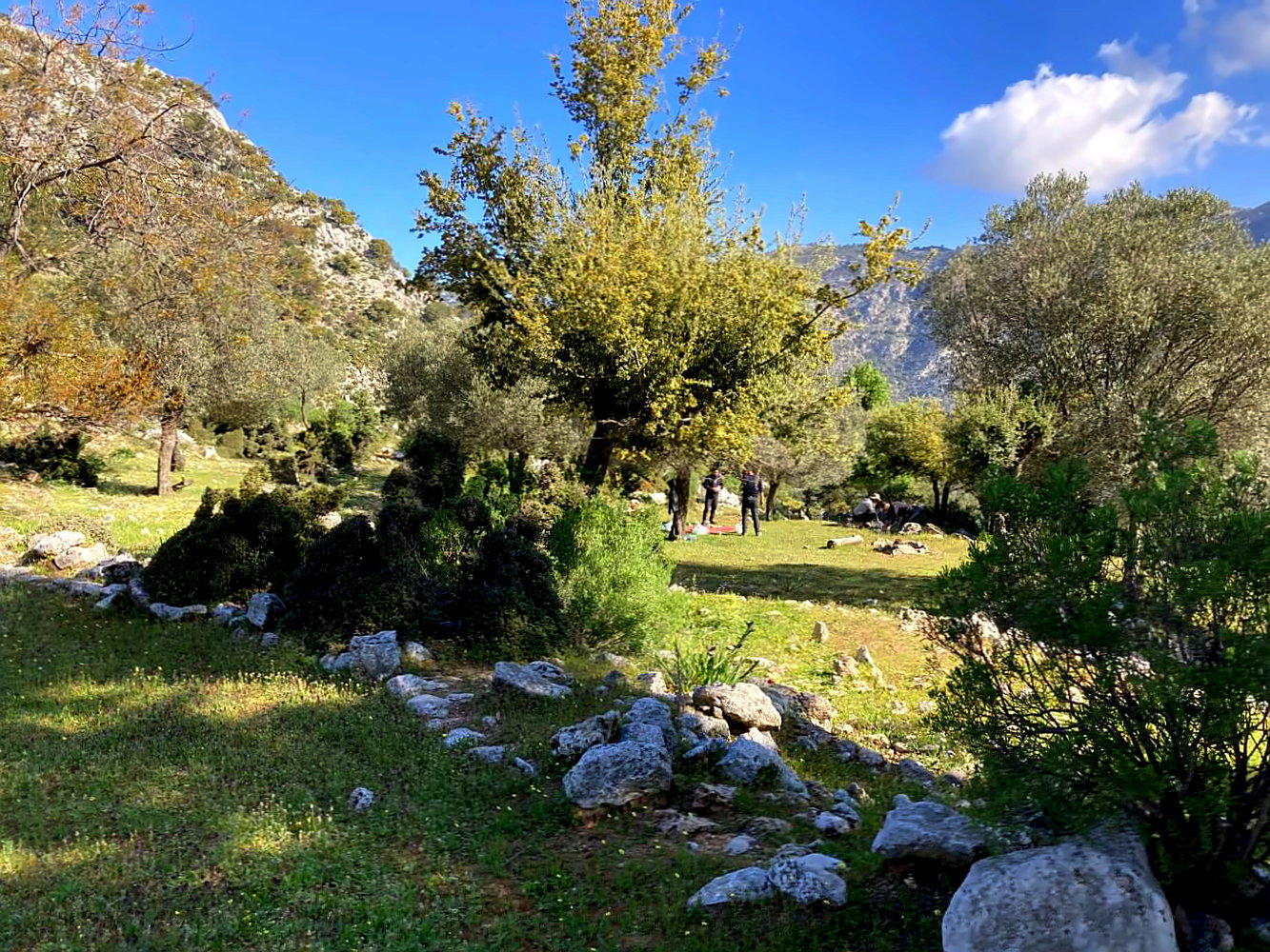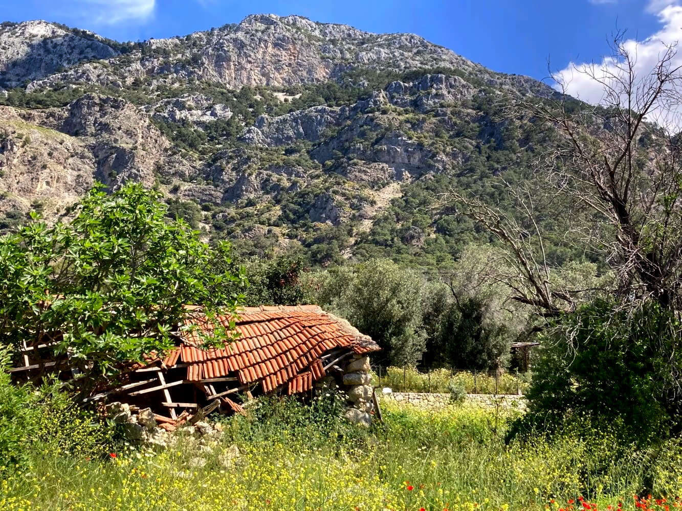 Hinter den Ruinen zweigt tatsächlich ein kaum erkennbarer Weg in die Felder ab, irgendwann taucht sogar wieder eine Markierung des Lykischen Wegs auf. Wie man das finden soll, wenn man nicht genau weiß, wonach man sucht, ist mir schleierhaft. Ist jetzt aber auch egal – hundert Meter weiter finde ich einen wunderbaren Platz im Schatten eines Baumes am Rand einer großen Wiese (Koordinaten: N36° 21.654 E29° 19.158).