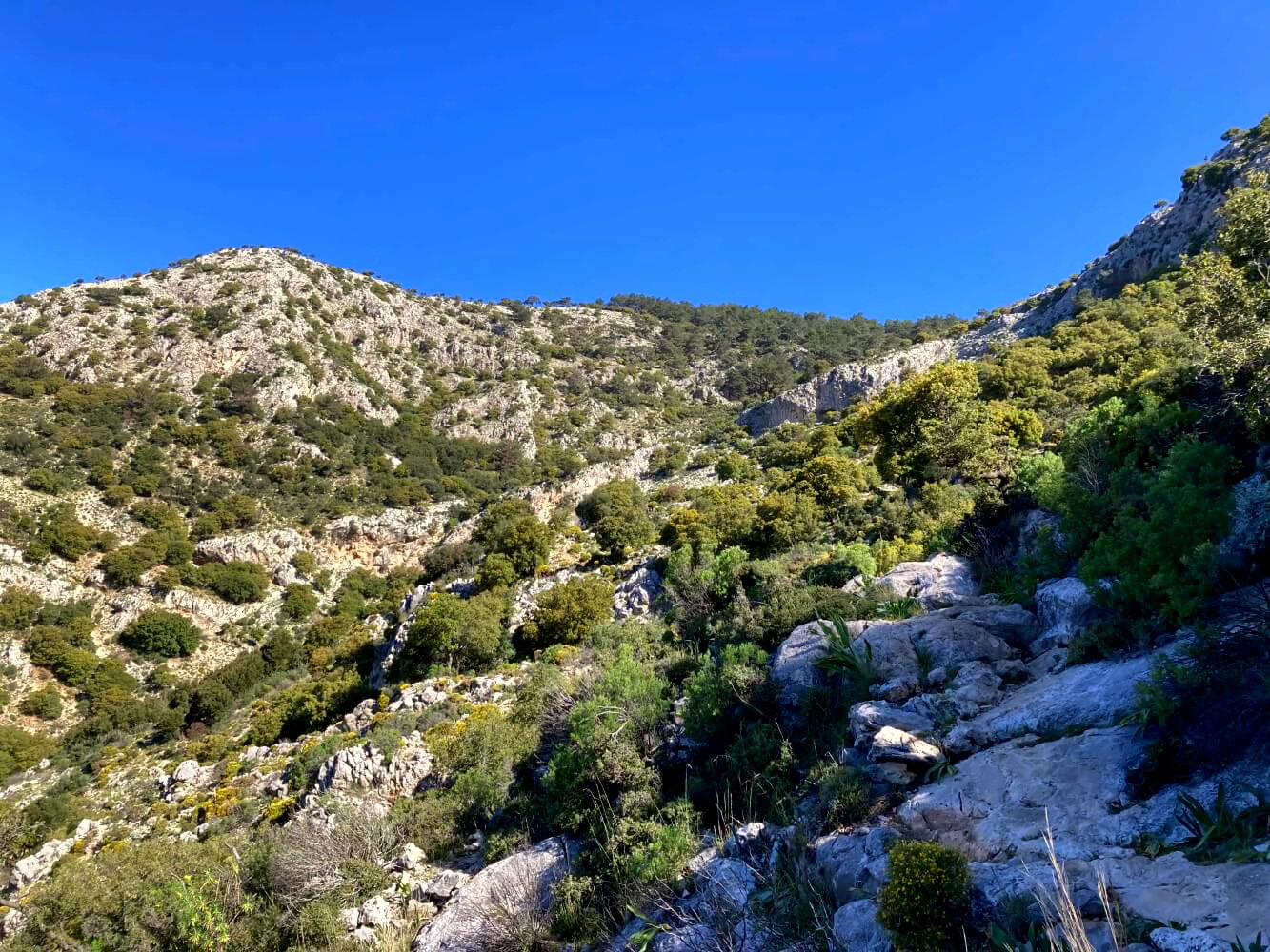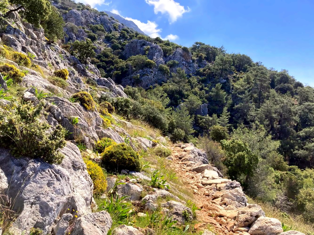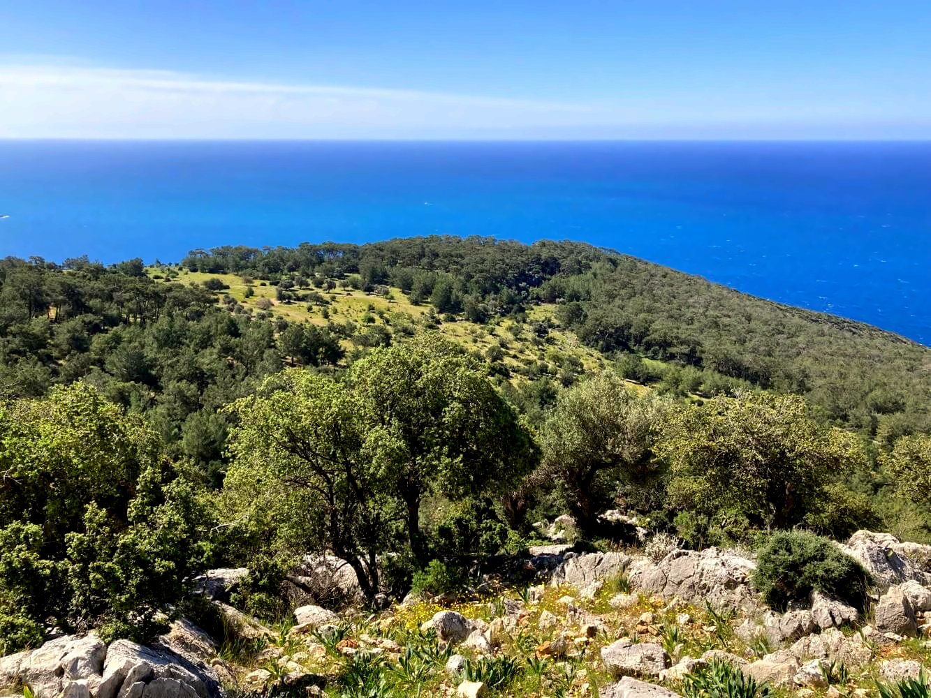 Bis Gavurağılı geht es steil die Berghänge hinunter. Der Weg ist stellenweise sehr rutschig und führt über loses Geröll, bietet aber nochmal fantastische Ausblicke über die Küste. Ich kann mich gar nicht daran sattsehen: Das türkisblaue Wasser, die bewaldeten Halbinseln, dazwischen immer wieder leuchtend grüne Wiesenstreifen und über allem die verkarsteten Kalksteinberge. Das ist wirklich das Mittelmeer von seiner allerschönsten Seite!