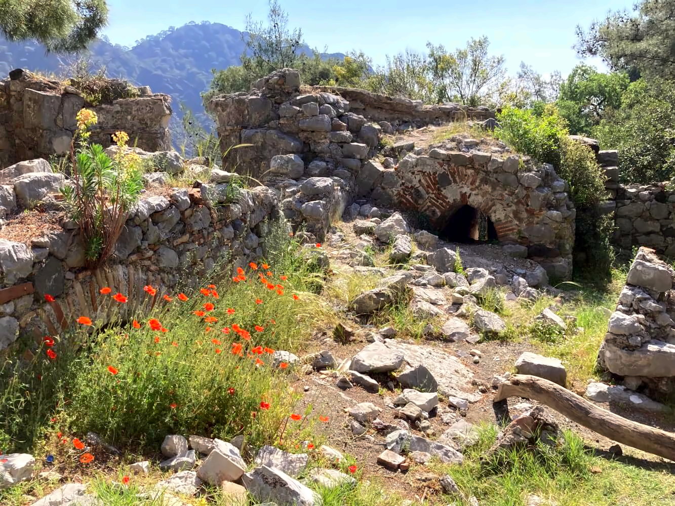Bei Tageslicht sind die Flammen ehrlicherweise etwas unspektakulär, weil ziemlich klein. Die meisten Besucher kommen daher auch erst am Abend. Trotzdem ist es ein schöner Aufstieg und bei den malerisch gelegenen Ruinen einer verfallenen Kirche mache ich erstmal ein paar Minuten Pause, genieße die Magie des Ortes. Im Gras blüht leuchtend roter Klatschmohn, ringsherum die dichtbewaldeten Berge, in der Luft liegt der harzige Duft der Pinien – eine wirklich zauberhafte Atmosphäre. Mittelmeer, ich liebe dich!