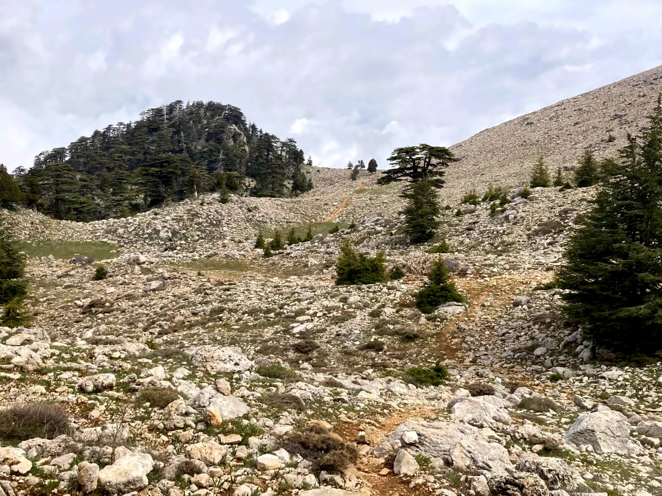 Knapp 500 Höhenmeter geht es direkt hinter der Emzik Çeşmesi zum Tahtalı-Pass hoch. Schön steil, aber meist auf angenehmen Waldwegen, nur ein paar Mal muss ich durch Abschnitte mit groben Felsbrocken laufen. Das hatte ich mir schlimmer vorgestellt. Am bewaldeten Pass auf 1.850 Metern angekommen, sehe ich einen Haufen Rucksäcke zwischen den Bäumen liegen. Anscheinend sind gerade ein paar Leute auf dem Weg zum Gipfel und haben ihr Gepäck hier zwischengelagert.