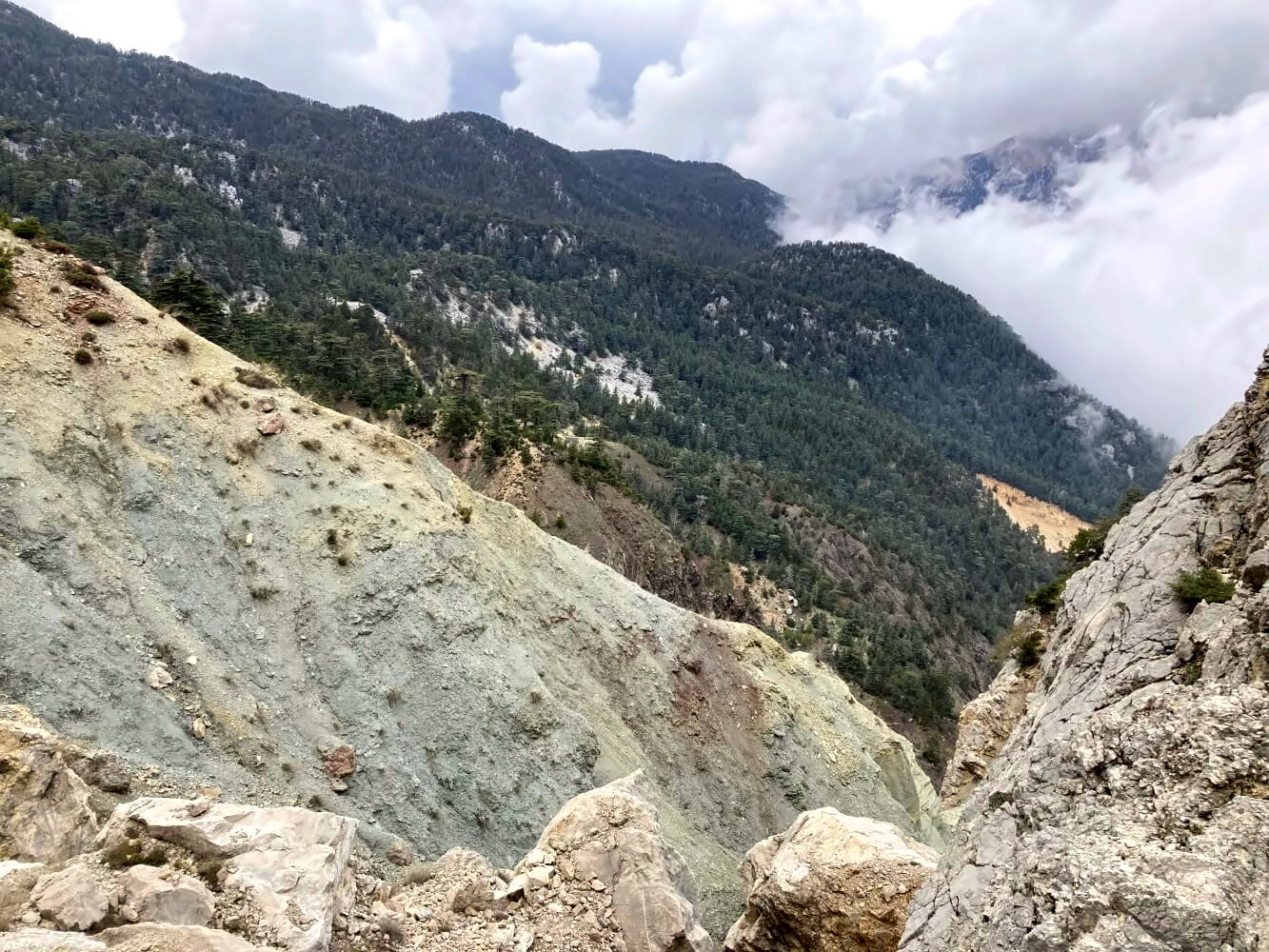 Leider verschlechtert sich das Wetter rapide, Wolken ziehen auf. Hinter Ulupınar überquere ich die große Küstenautobahn D400 und steige weiter durch die Wälder auf. Die Aussichten sollten jetzt immer besser werden, leider verdecken Wolken mein Blickfeld. Den Tahtalı kann ich immer nur in Schemen erkennen. Dafür bleibt der Weg spannend: Vor den Quellen von Ulupınar wird munter rumgekraxelt, weil der Pfad sich mal eben im Dickicht verabschiedet. Bis ich Beycik erreiche, vergeht eine halbe Ewigkeit.