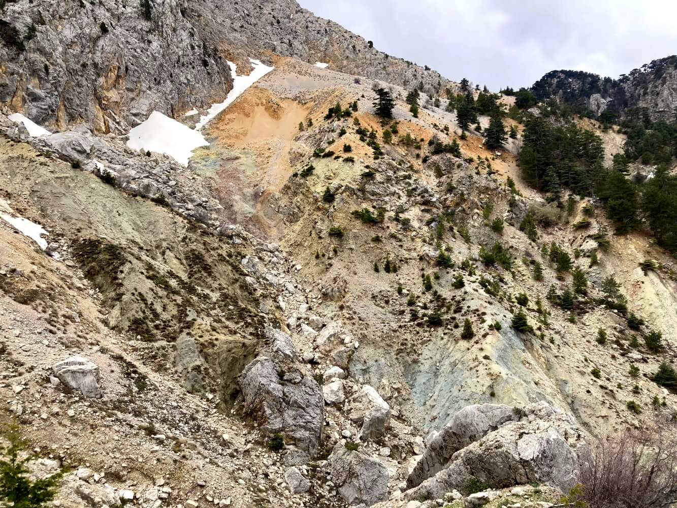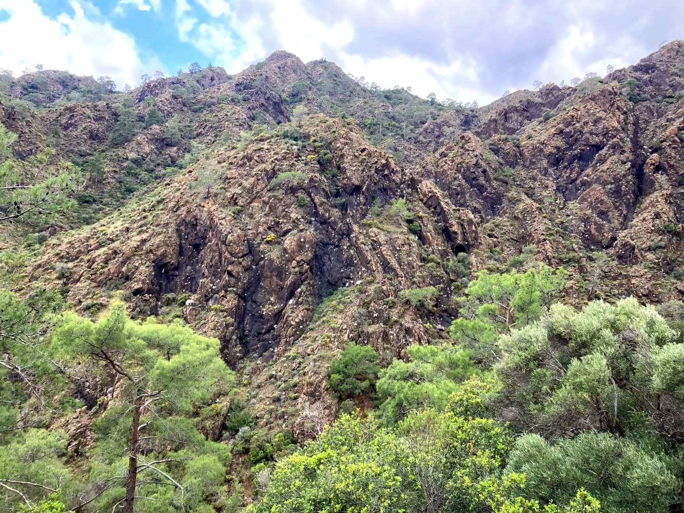 Für mich geht es stattdessen Richtung Osten. Hinter der Yayla zweigt ein geröllübersäter Trampelpfad ab, immerhin noch markiert. Das Gelände ist hier schon felsiger, langsam wird es spannend. Als ich eine kleine Anhöhe hochkraxele, eröffnet sich erstmal der Blick auf die Nordflanke des Tahtalı – äußerst beeindruckend. Die massiven Felswände fallen hier mehrere hundert Meter steil ins Tal ab und werden von riesigen schuttgefüllten Erosionsrinnen durchzogen. Genau da führt der Weg durch!