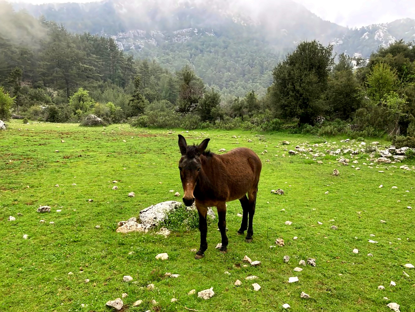 Danach beginnt der lange Abstieg an die Küste. Ich bin Stunden unterwegs, mal auf mehr, mal auf weniger, mal auf gar nicht erkennbaren Wegen. Ich wandere durch einsame Wälder, komme an winzigen Holzverschlägen vorbei. Keine Menschenseele ist hier unterwegs, nur einem Esel auf einer Wiese begegne ich. Einmal raschelt es im Unterholz und ich sehe schemenhaft ein braunes Etwas. Nein… Bären gibt es hier nicht. Ist nur ein Wildschwein.