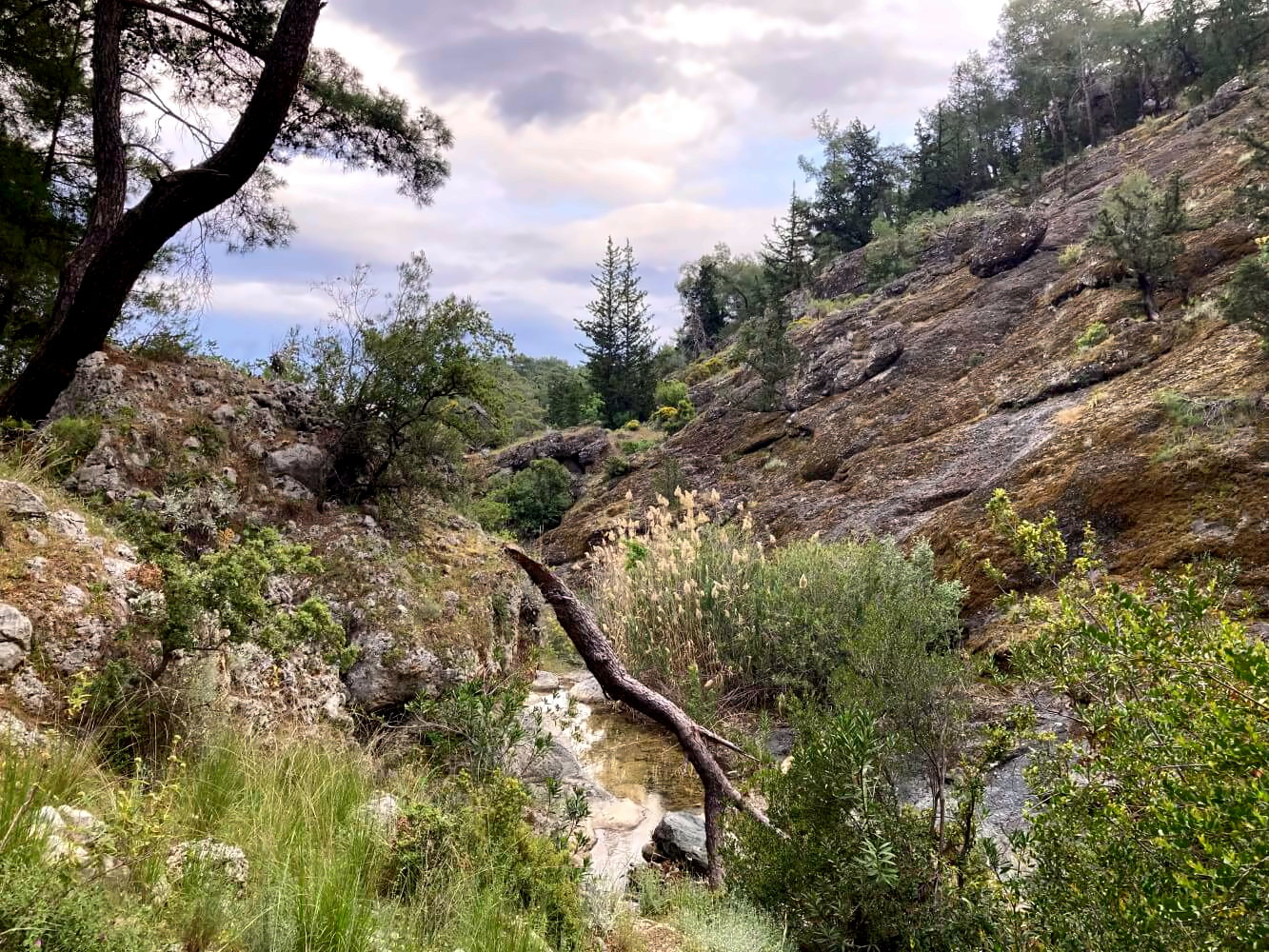 Bin deine Tahtali-Umrundung Anfang Mai nachgegangen, auch in drei Tagen, nur in einer abgeänderten Variante – von Tekirova hatte ich den in der Eastern Lycia Map eingezeichneten und von Kate Glow beschriebenen Weg durch die Dschungel-artigen „tepe“ gegangen – DAS war ein echtes Abenteuer… Wenig Markierungen, zum Schluss so gut wie gar nichts, ausgesetzte Wege, das hartnäckige Gestrüpp das an meiner Hose klebte, eine richtige Wildnis… Am Ende musste man scramblen und fast schon klettern durch ein ausgetrocknetes Bachbett. War froh, dort an der ..?Koyu (das mit der Zisterne, kann mich gerade nicht an den Namen erinnern) rausgekommen zu sein – war aber das absolute Highlight!