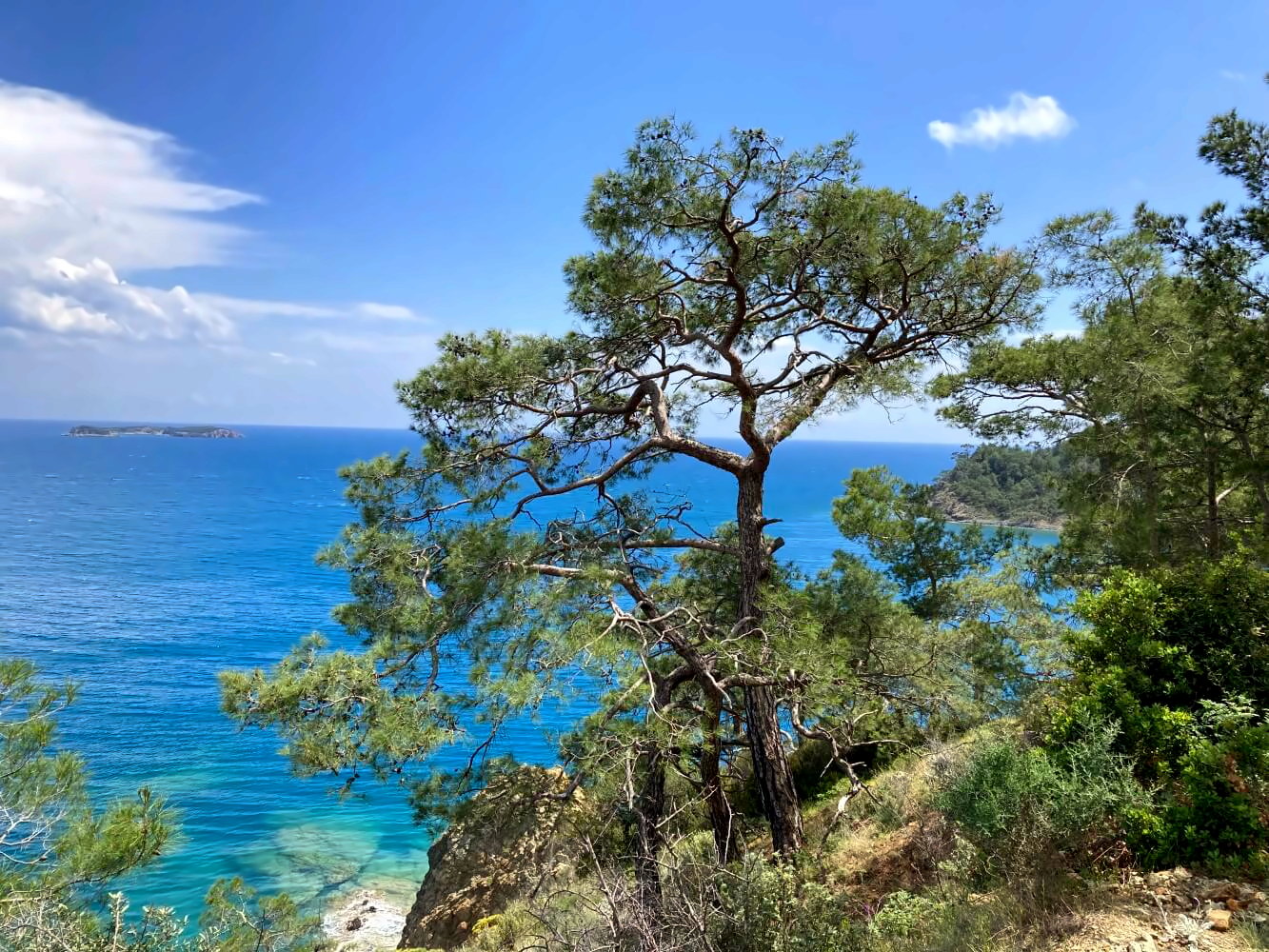 Tag 3 beginnt mit einer langen Wanderung über eine Schotterpiste. Die ist sogar als Wanderweg ausgezeichnet und auch Teil des Lykischen Wegs. Zum Laufen ist es aber nicht ganz so spannend. Natürlich sind die Aussichten auf die Buchten an der Küste fantastisch und auch die dicht bewaldeten Ausläufer der Bey Dağları sind sehr hübsch anzuschauen. Im Vergleich mit gestern fühlt es sich es aber doch ein bisschen mehr nach Pflichterfüllung als Genuss an.